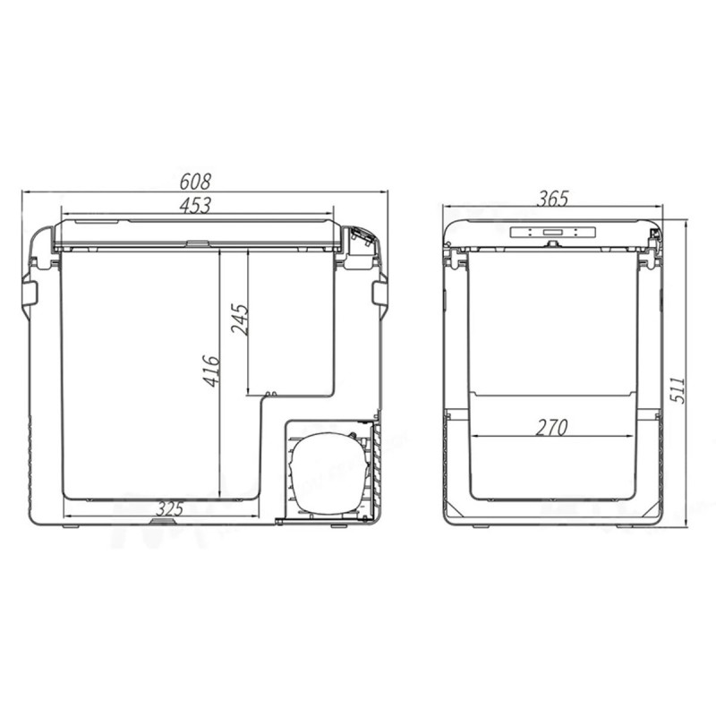 Об'єм камери: 50 лНапруга: DC - 12/24 В; AC - 110/220 В (через адаптер)Потужність: 60 ВтНалаштування температурного режиму: від -20°C до +20°CТемпературний режим експлуатації: +10°C - +43°CРівень шуму: 45 дБКількість камер: 1 Тип охолодження: компресорнийТип холодоагенту: R1234yfКлас енергоспоживання: А++Кліматичний клас: T, ST, N, SNВнутрішній розмір камери ШхВхГ (макс. значення): 453х416х270 ммГабарити зовнішні ШхВхГ: 608x511x365 ммВага: 13 кгКомплектація: Холодильник, мережевий адаптер 220 Вт, кабель для підключення до джерела постійного струму 12/24 Вт, інструкція з експлуатації, гарантійний талон