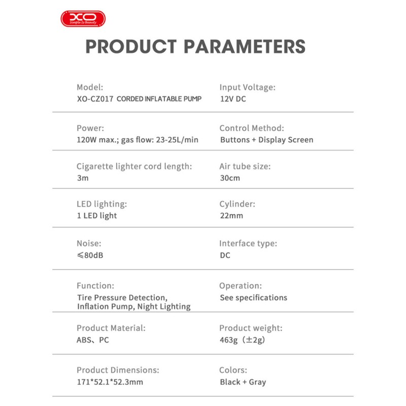 XO CZ017 — портативний компресор, незамінний помічник для швидкого накачування шин та інших надувних виробів у будь-яких умовах. Компактний і функціональний, він стане ідеальним доповненням до твого автомобіля.