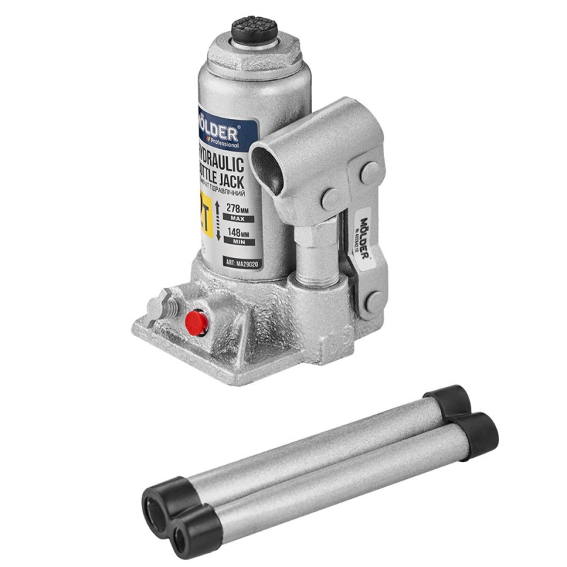 Гідравлічний домкрат Molder – універсальний вантажопідйомний механізм, призначений для підйому, утримання та фіксації автомобіля у процесі проведення ремонтних та діагностичних робіт. Модель пляшкового типу, з максимальною вантажопідйомністю 2 т, що цілком достатньо для легкового автомобіля або мікроавтобуса. Перевагою даного домкрата є хороша висота підйому 278 мм та висота підхоплення 148 мм. Корпус домкрата, у формі пляшки, повністю виконаний із міцного металу. Подовжена металева ручка, складна конструкція, для більш ефективного підняття поршня плунжерного насоса.
