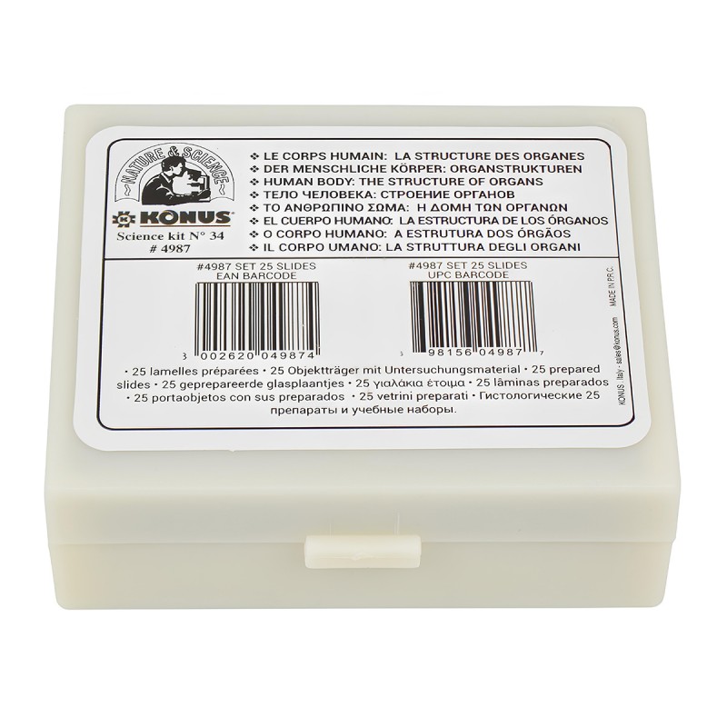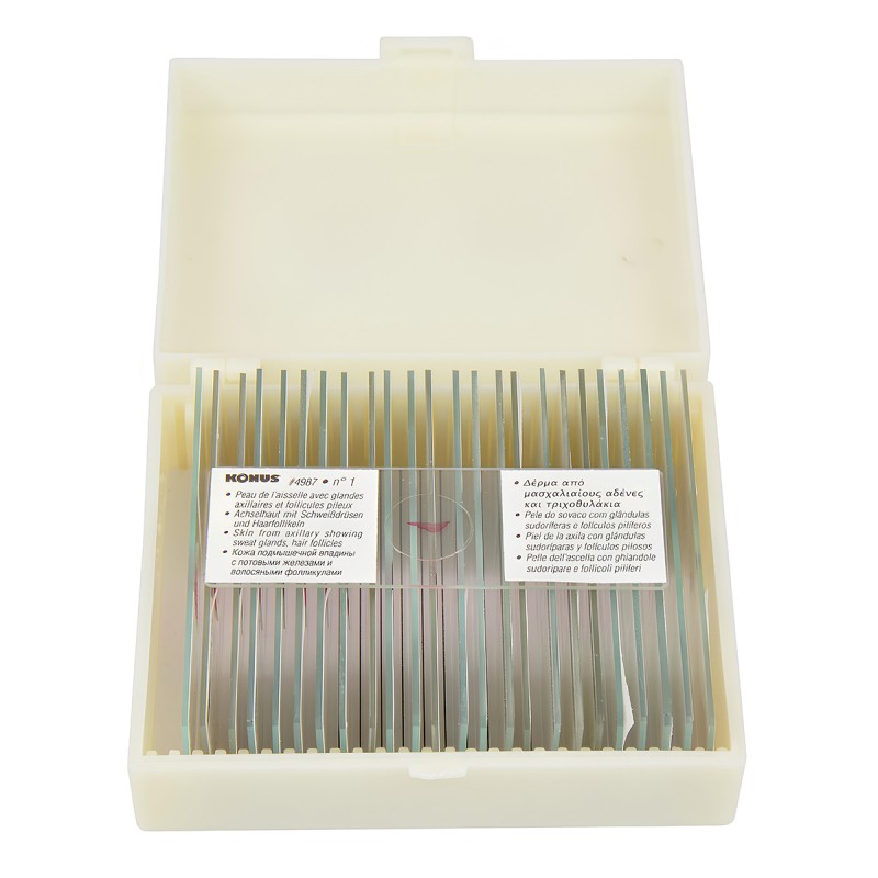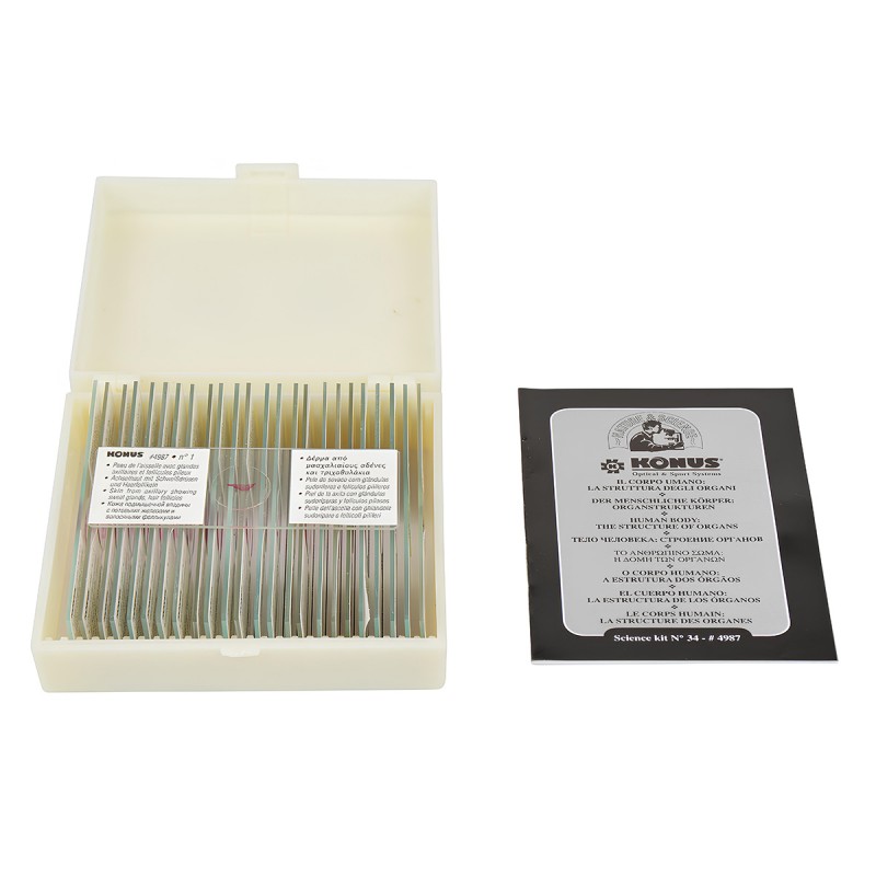 Ілюстрований посібник з анатомії та гістології, який складається з 25 професійно підготовлених та пофарбованих мікропрепаратів. Студенти зможуть вивчити будову всіх видів тканин здорового людського організму - епітеліальної, м'язової, нервової та сполучної. Препарати упаковані в дерев'яний бокс з роздільниками, кожен слайд має наклейку з описом 8 мовами.