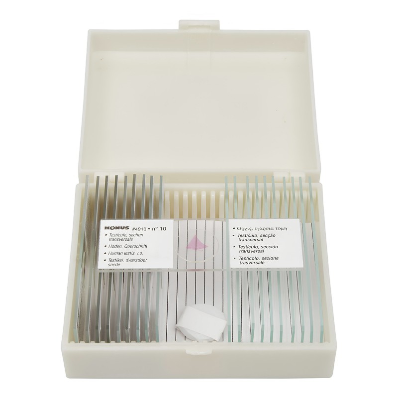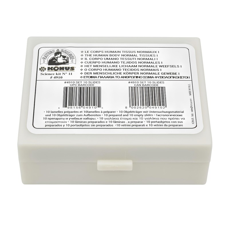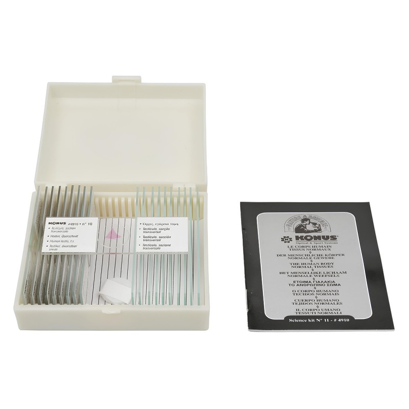 Ретельно підготовлений набір препаратів тканин людського тіла від Konus для вивчення під мікроскопом методом світлого поля. До складу входять 10 зразків з нормальними (здоровими) тканинами та по 10 штук предметного та покривного скла для самостійного виготовлення слайдів. Скло акуратно укладено в пластиковий бокс на засувці; всі слайди забезпечені наклейками з описом препарату 8 мовами.