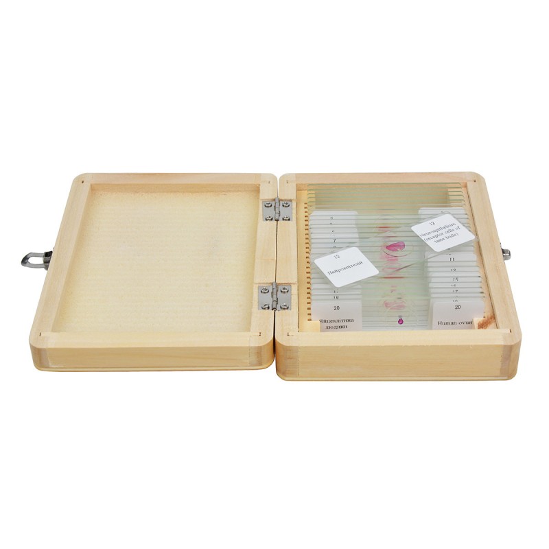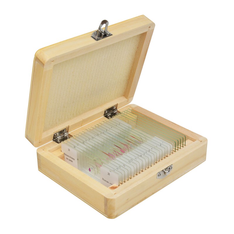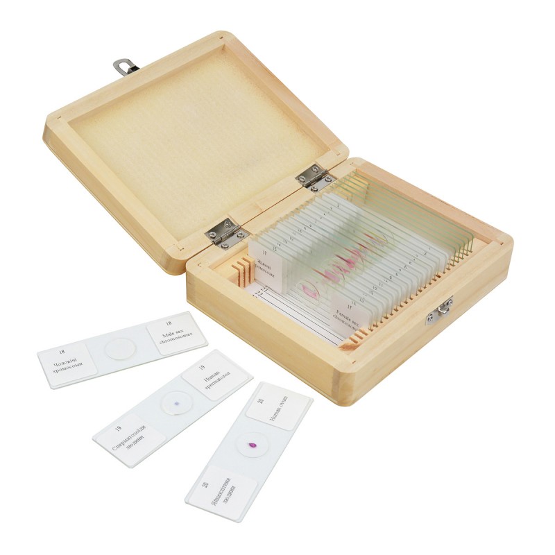 Зміст набору слайдів для мікроскопії SIGETA ADVANCE АНАТОМІЯ покриває всю шкільну програму на предмет. Серед готових препаратів містяться зразки різних тканин людського тіла, зрізи кровоносних судин, X та Y-хромосоми, статеві клітини - всього 20 слайдів.