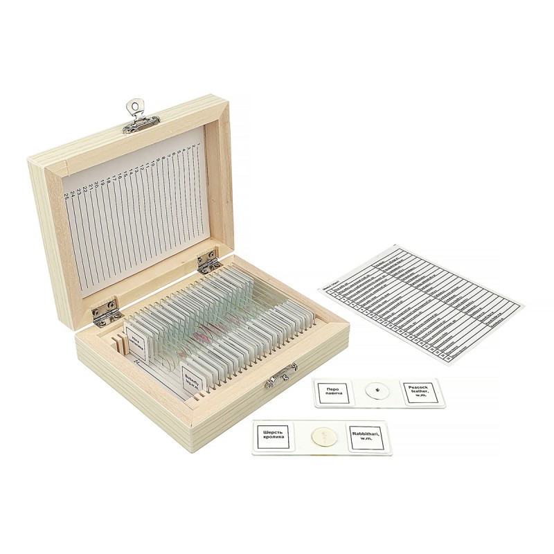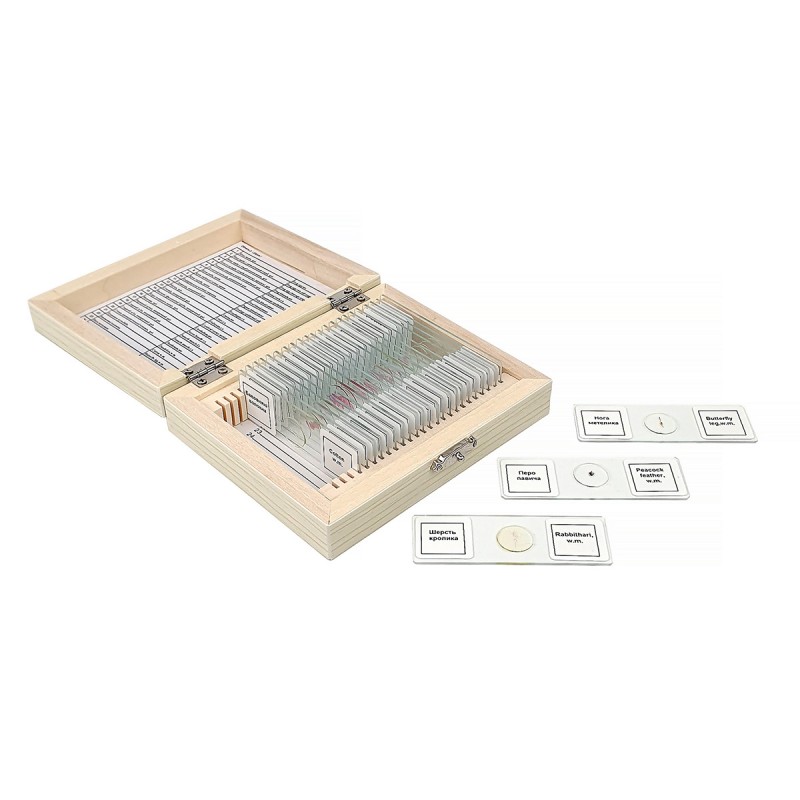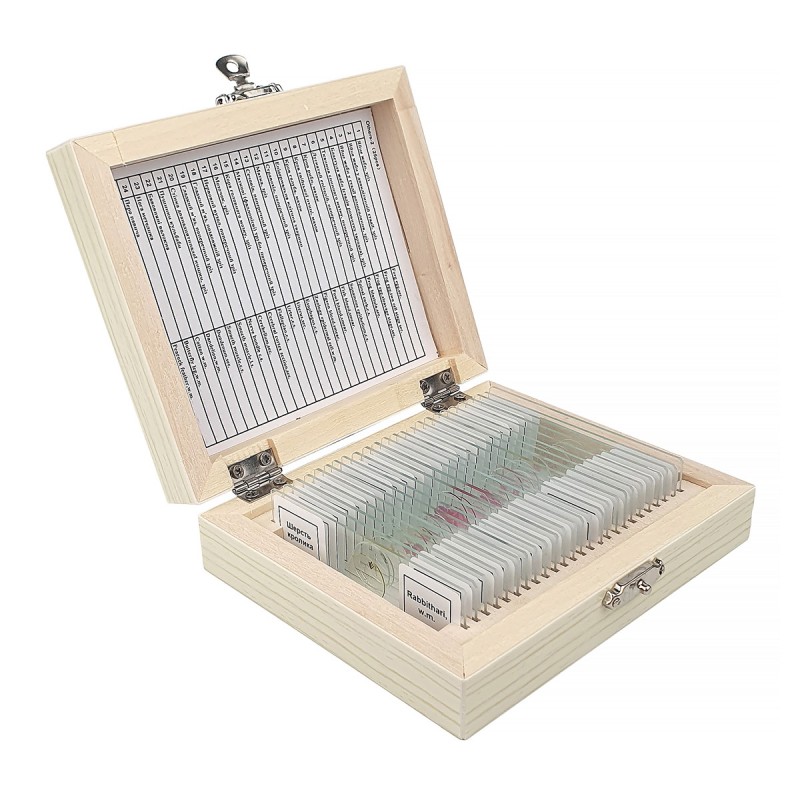Набір із 25 слайдів для біологічного мікроскопа, що ілюструють різні біологічні закономірності та процеси.