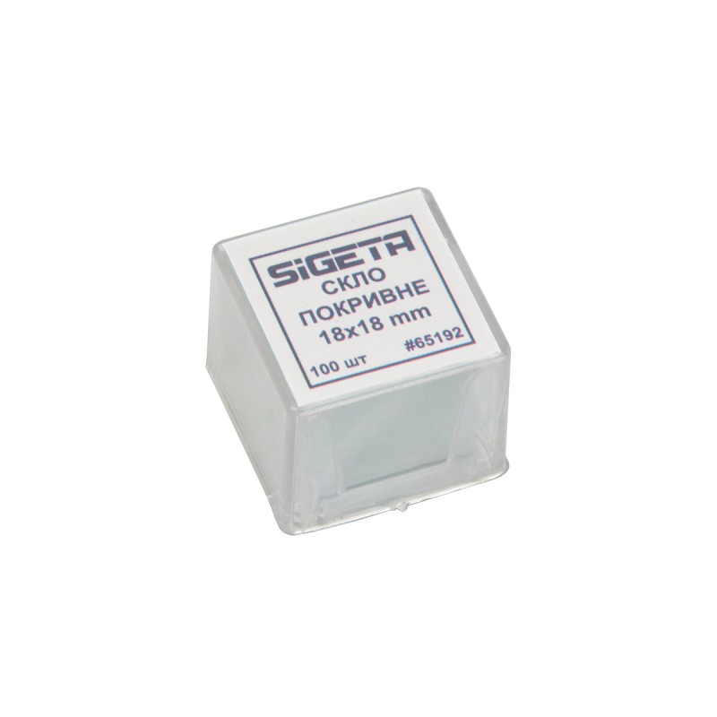 Покривне скло SIGETA 18x18 мм – це набір із 100-та тонких та абсолютно прозорих скляних пластин для накриття мікропрепаратів на предметному склі.
