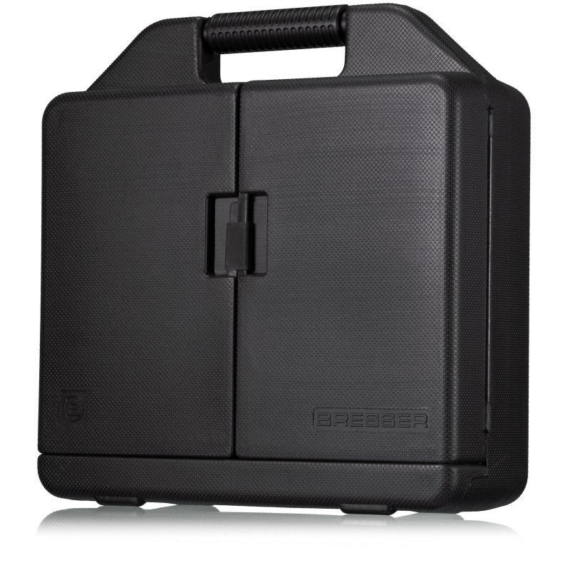 На відміну від моделей у картонних коробках, цей мікроскоп постачається у жорсткому пластиковому кейсі.