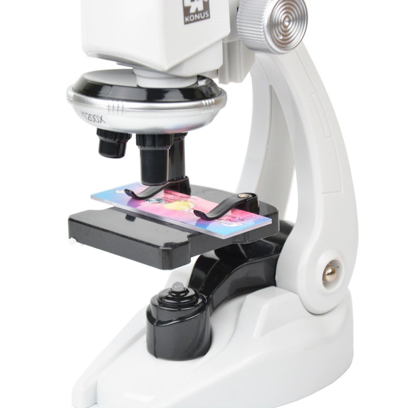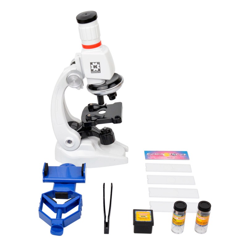 KONUS KONUSTUDY-5 — це дитячий набір для мікроскопії, до якого входить мікроскоп, адаптер для смартфона, а також необхідний набір аксесуарів для створення та вивчення зразків. Адаптер, що входить в комплект, дозволяє прикріпити смартфон до окуляра і виводити зображення на великий екран. Тепер діти можуть разом переглядати барвисті зображення зі слайдів, а також робити фото та ділитися ними у соціальних мережах. Адаптер має регульовану конструкцію, що дозволяє розмістити в ньому практично будь-який смартфон з діагоналлю від 3.7" до 5.5".