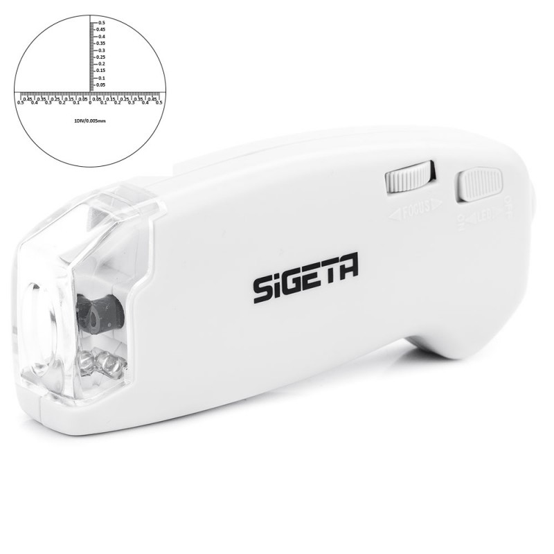 SiGETA MicroGlass 150x R/T (з шкалою) — легкий компактний мікроскоп з можливістю проведення мікрометричних вимірювань. Завдяки нанесеній на одну з лінз мікрометричній шкалі і потужному збільшенню в 150х можна дізнатися точні лінійні розміри дуже маленьких об'єктів. Крок розмітки становить лише 0.005 мм; в поле зору мікроскопа повністю поміщається коло діаметром 2.8 мм.