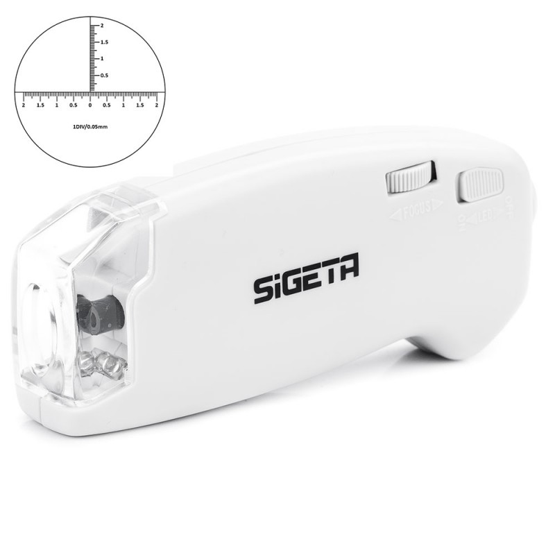Мікроскоп SIGETA MicroGlass 40x R/T (з шкалою) — це якісна кишенькова модель для спостереження і вимірювання мікроскопічних об'єктів: одна з лінз має шкалу з ціною поділки 0.05 мм. Предмети розміром до 2х2 мм повністю поміщаються в поле зору приладу, а завдяки скляній оптиці мікроскоп видає зображення з високою роздільною здатністю. Кратність збільшення — 40х.