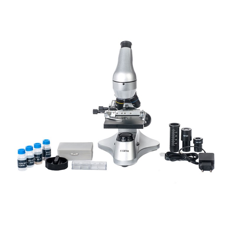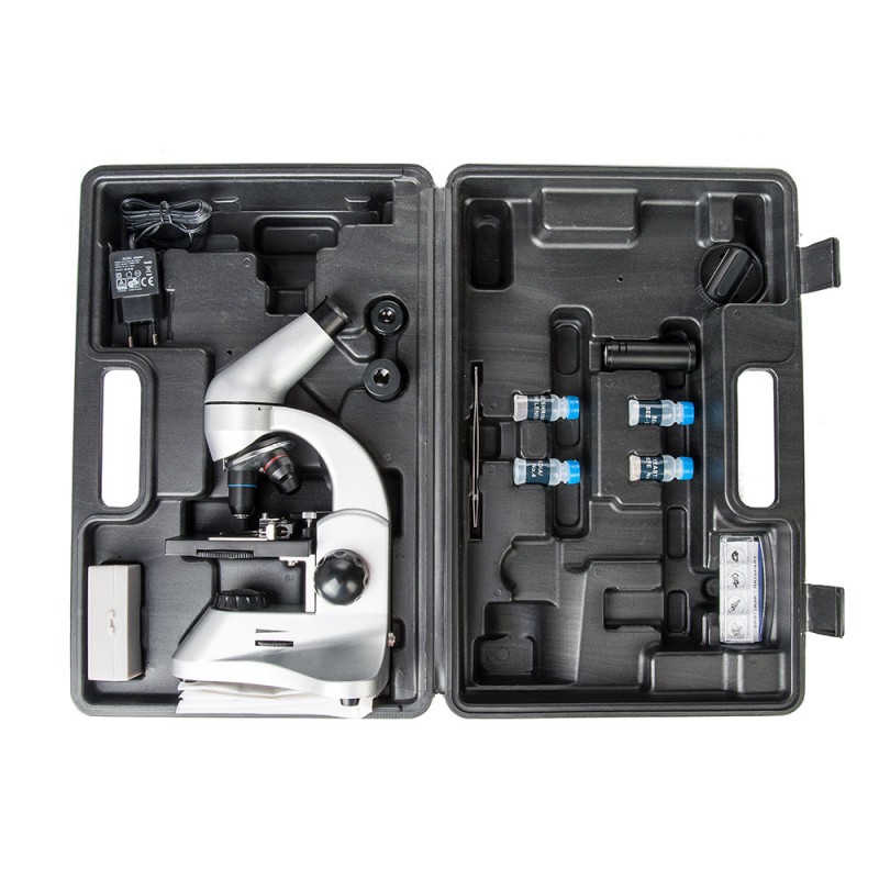 SIGETA PRIZE NOVUM 20x-1280x (в кейсі) — компактний і зручний портативний мікроскоп шкільного рівня. Завдяки наявності двох типів підсвітки під мікроскопом можна вивчати прозорі зразки і пласкі непрозорі предмети — листя дерев і аркуші паперу, монети, марки, шматочки тканини.