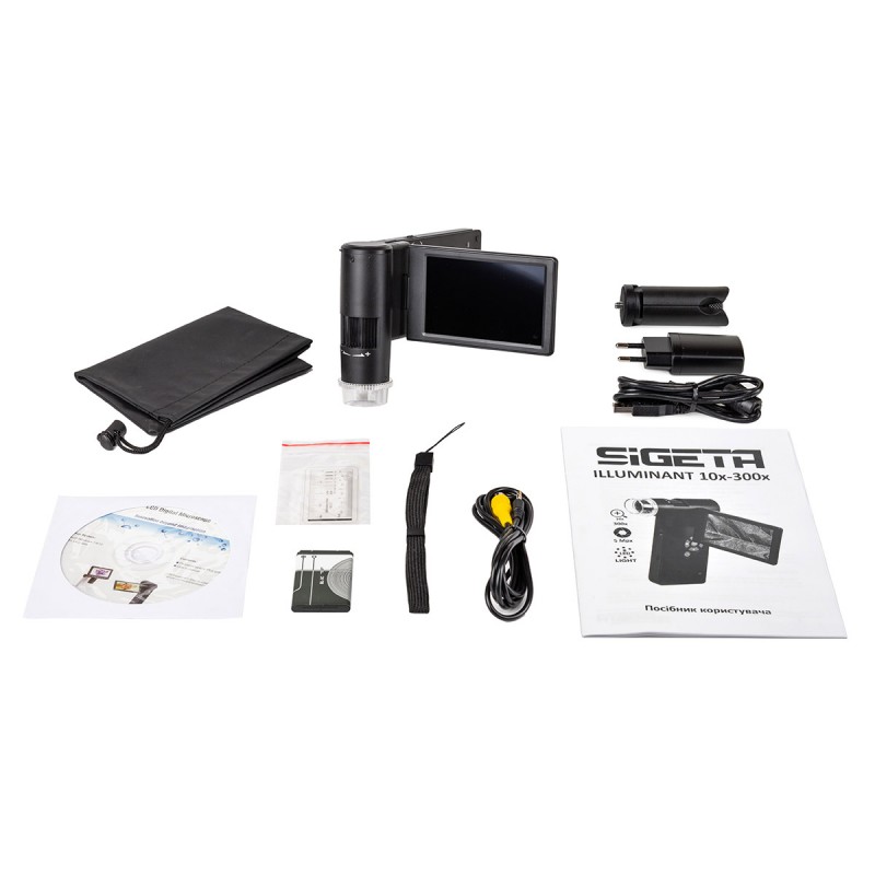 SIGETA Illuminant 10x-300x — портативний цифровий відеомікроскоп для вивчення непрозорих об'єктів у 3D режимі за межами майстерні або лабораторії. Модель цікава компактними габаритами та наявністю якісного, відкидного дисплея. Підійде для таких напрямків як нумізматика, поліграфія, біологія та медицина, садівництво, ювелірна справа. Прилад може використовуватися для контролю якості дрібних ремонтних робіт, пошуку дефектів, контролю продуктів харчування (виявлення плісняви і т.д.), у хобі, навчанні тощо. Максимальне оптичне збільшення становить 300 крат, а при використанні цифрового зуму — 1200 крат.