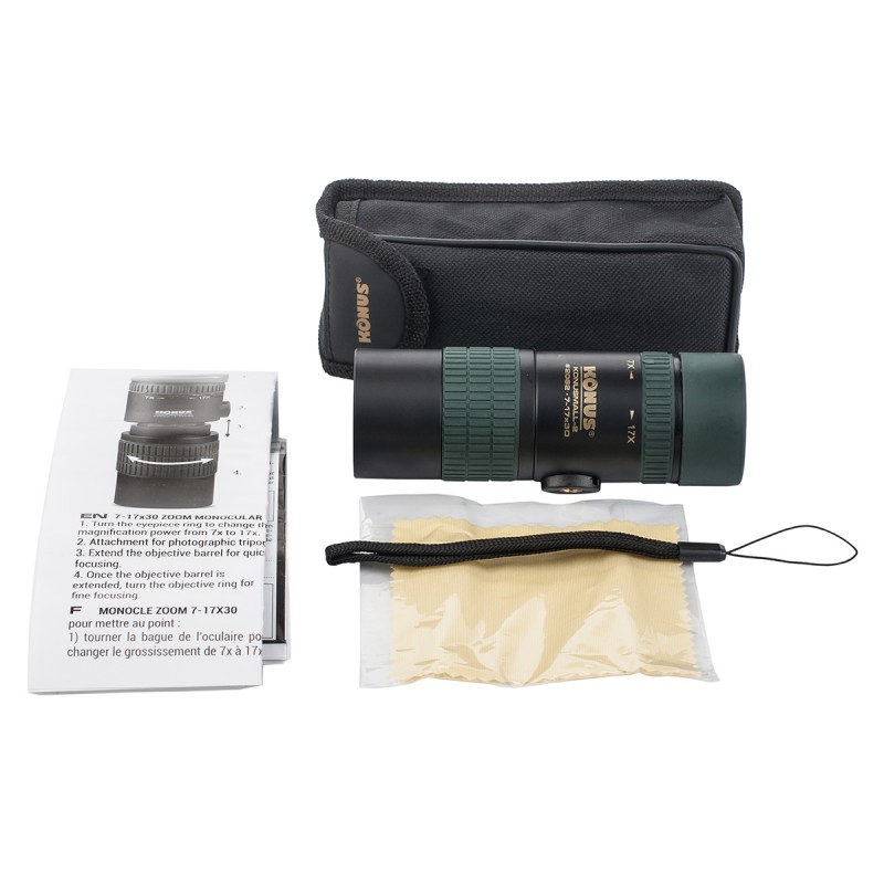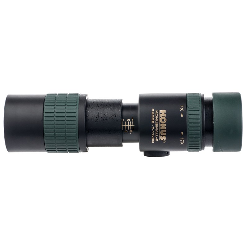 KONUS Konusmall-2 7-17x30 — компактний zoom-монокуляр з подвійною системою фокусування та роз'ємом для фотоштативу. При роботі на кратності до 10-12x установка приладу на штатив не потрібна, але на великих збільшеннях вона дозволить стабілізувати зображення, що тремтить через вібрацію рук.