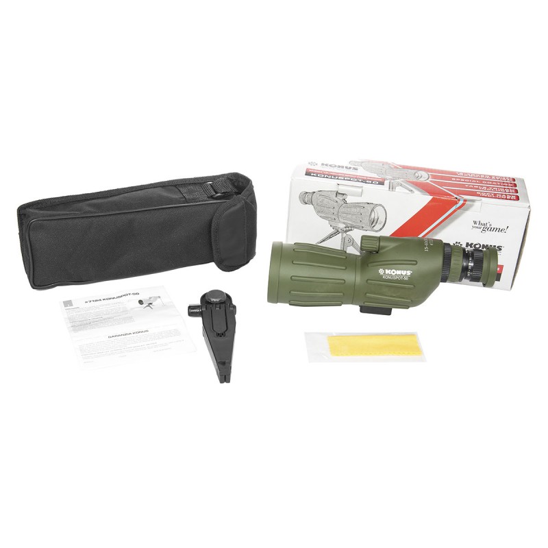 Малогабаритна підзорна труба KONUSPOT-50 поєднує в собі невеликі розміри і досить високі технічні характеристики. Картинка відрізняється підвищеною яскравістю і відмінною оптичною прозорістю, в тому числі і при низькому рівні освітленості. Підзорна труба Konus KONUSPOT-50 захищена від вологи, має повністю прогумований корпус. Збільшення змінне, 15-45х, регулюється кільцем на окулярі. Фокусування здійснюється гвинтом на корпусі.