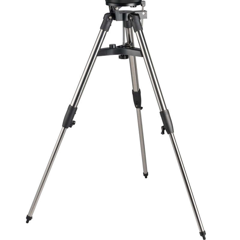- Регульований польовий триногий штатив із полярною висотою — алюмінієвий статив із нержавіючими елементами регулюється за висотою від 105 до 155 см, що дозволяє підлаштовувати положення окуляра під зріст спостерігача. Вбудована полярна висота на верхній частині штативу спрощує налаштування екваторіального режиму і точне вирівнювання за широтою від 25° до 90°. Вбудований рівень допомагає швидко і точно вирівняти монтування по горизонту. Штатив із нержавіючої сталі та алюмінію витримує навантаження і стабільно тримає телескоп навіть на нерівній поверхні.