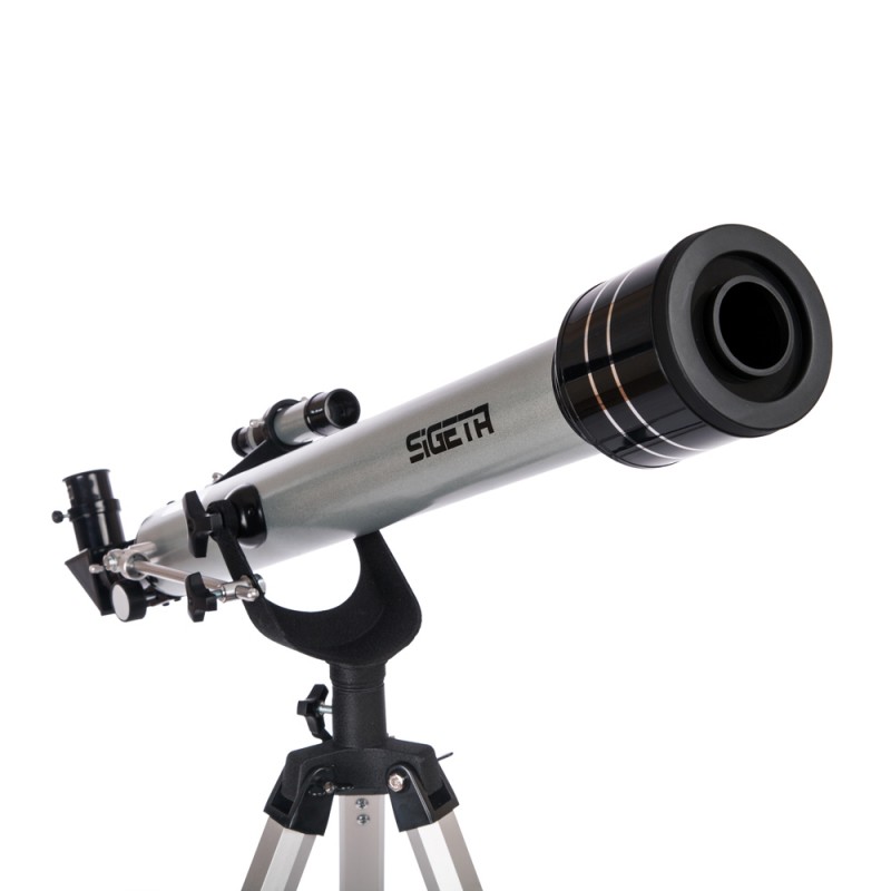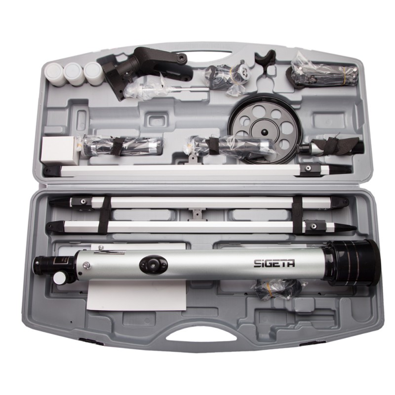 SIGETA Crux 60/700 — портативний телескоп початкового рівня в зручному для перенесення пластиковому кейсі. Вдала модель для тих, хто хоче почати розгадувати таємниці зоряного неба. Встановлений на простому в експлуатації вилковому альт-азимутальному монтуванні, штатив телескопа має полицю для аксесуарів.
