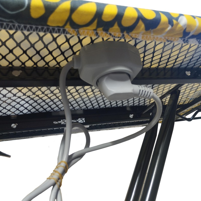Завдяки вбудованій розетці під робочою поверхнею та кабелю довжиною 125 см, праску можна підключити без зайвих подовжувачів, а підпружинений тримач для кабелю утримує шнур праски у піднятому положенні, запобігаючи його заплутуванню та забезпечуючи свободу рухів. Робоча поверхня розміром 120 × 38 см дозволяє комфортно прасувати великі речі — постіль, сорочки, сукні. Висота регулюється в 4 положеннях — від 73 до 93 см, що забезпечує зручну робочу позицію навіть для користувачів високого зросту.
