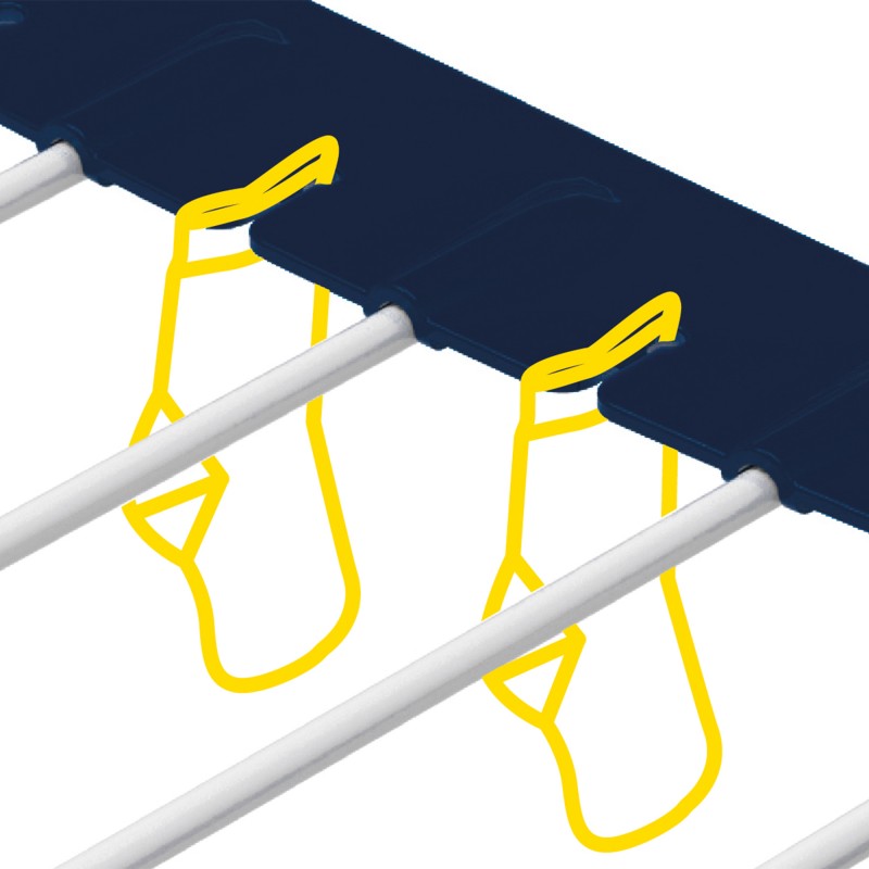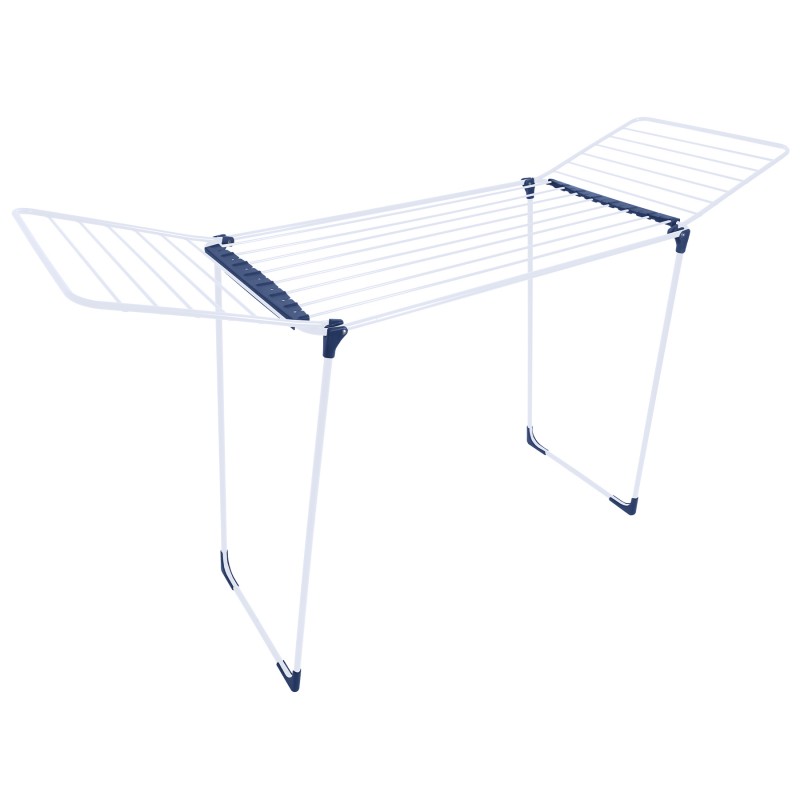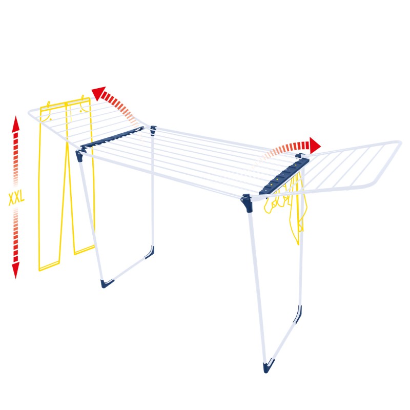 | Додаткові характеристики | ProLine - товсті стрижні, що запобігають зім'яття білизни та зменшують вагу конструкції. Patented Design - запатентована конструкція крил сушарки, що дозволяє збільшити навантаження на крила. Дві пластикові панелі для сушки шкарпеток і дірбних речей; Збільшена висота бічних крил дозволяє сушити штани в повну довжину; Пластикові ніжки запобігають псуванню підлогової поверхні. Механізм блокування ніжок в робочому положенні |