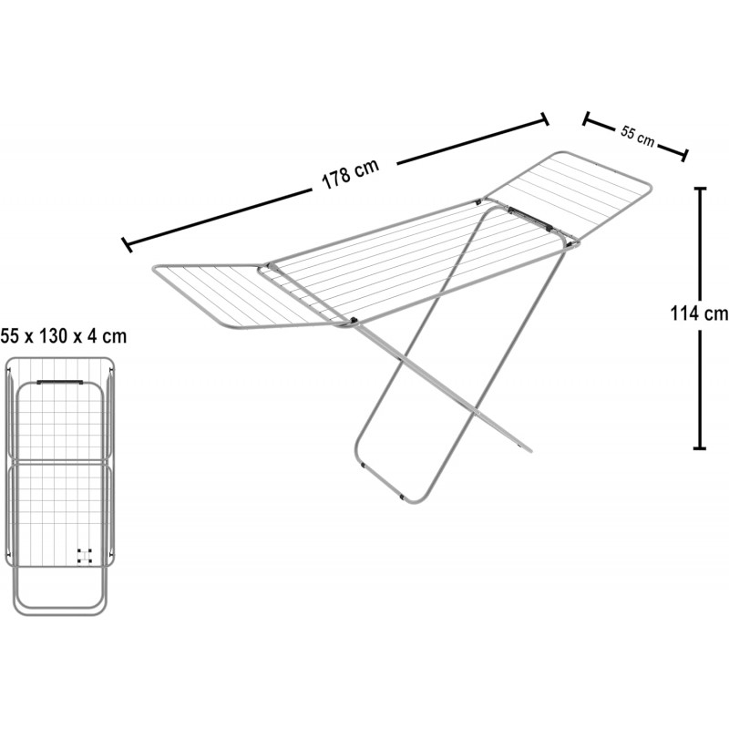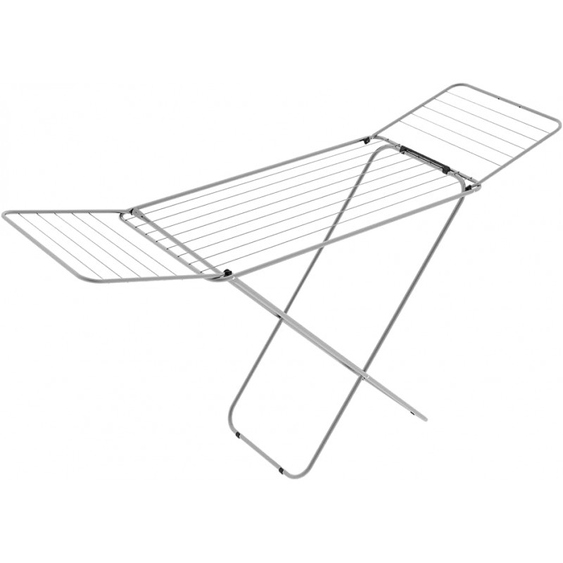 Класична модель з відкидними «крилами», які збільшують корисну площу для сушіння та легко складаються для зберігання. Конструкція виготовлена з пофарбованої сталі з антикорозійним покриттям, що робить її стійкою до вологи та іржі.18 метрів, що дозволяє розмістити до 8 кг білизни (приблизно одне повне завантаження пральної машини).