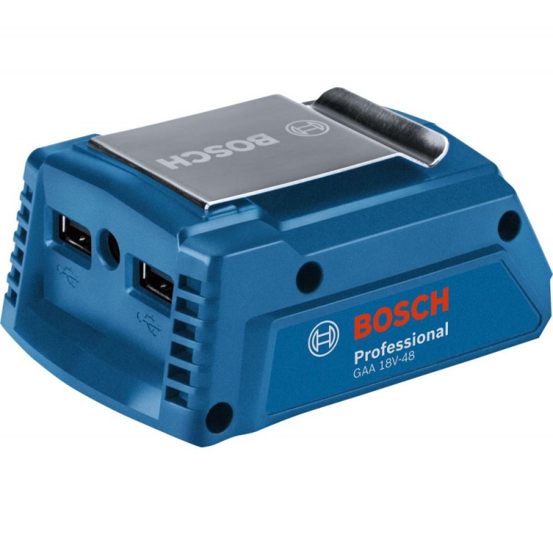 GAA 18V-48 Professional перетворює акумуляторні батареї Bosch 18 В на потужні зарядні пристрої USB із зарядним струмом 2 х 2,4 А. Завдяки компактній конструкції зарядний адаптер USB легко носити з собою, а металевий затискач на поясі гарантує, що запас енергії завжди буде під рукою. Коаксіальний штекер забезпечує енергією одяг з підігрівом від Bosch, щоб захистити від холоду під час роботи та відпочинку на свіжому повітрі. GAA 18V-48 Professional ідеально підходить для заряджання пристроїв, що живляться від USB, та одягу з підігрівом від Bosch. Він сумісний з усіма акумуляторами системи Bosch Professional 18 В. Також сумісний з AMPShare, міжбрендовим альянсом акумуляторів.