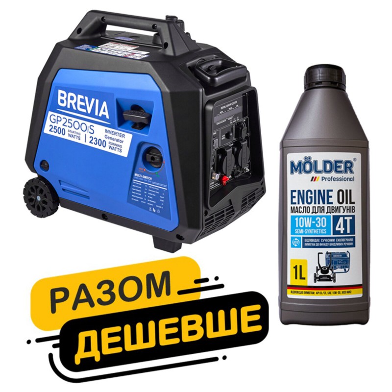 Набір складається: - Генератор Brevia інверторний бензиновий 2,5кВт (ном 2,3кВт) - 1 шт. - Масло Molder Engine Oil 4T 10W-30 1л - 1шт.