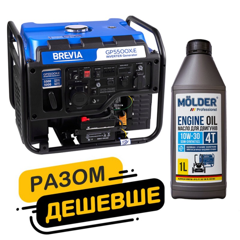 Набір складається: - Генератор Brevia інверторний бензиновий 5,5кВт (ном 5,0кВт) з електростартером - 1 шт. - Масло Molder Engine Oil 4T 10W-30 1л - 1шт.