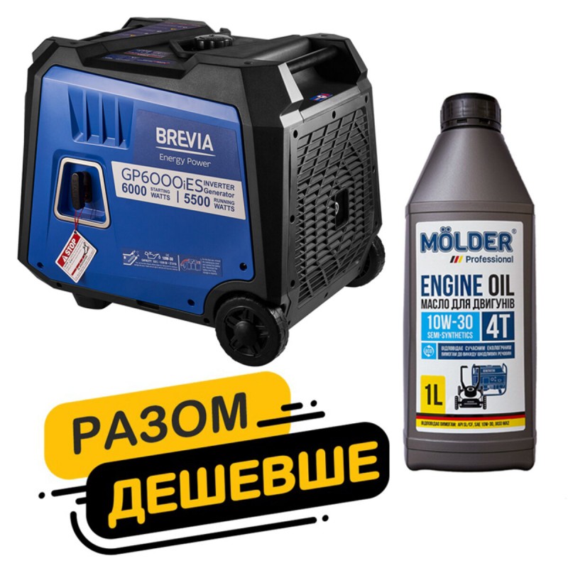 Набір складається: - Генератор Brevia інверторний бензиновий 6,0кВт (ном 5,5кВт) з електростартером - 1 шт. - Масло Molder Engine Oil 4T 10W-30 1л - 1шт.