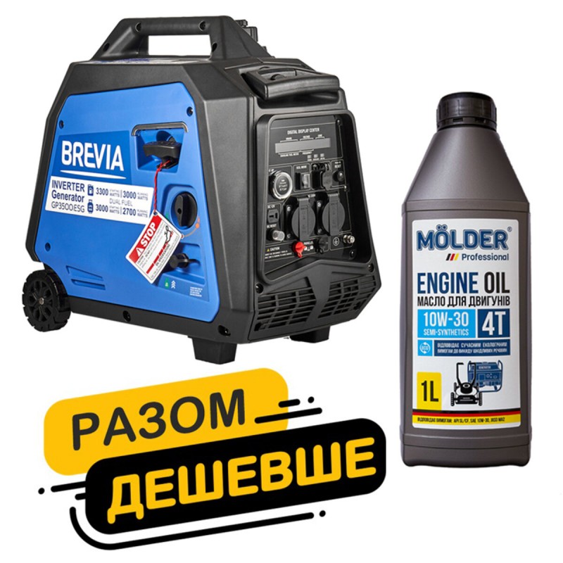 Набір складається: - Генератор Brevia інверторний газобензиновий 3,3кВт DUAL FUEL (ном 3,0кВт) з електростартером - 1 шт. - Масло Molder Engine Oil 4T 10W-30 1л - 1шт.
