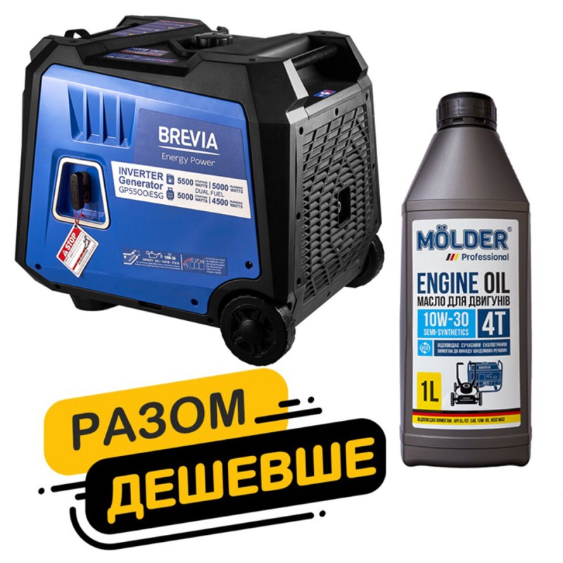 Набір складається: - Генератор Brevia інверторний газобензиновий 5,5кВт DUAL FUEL (ном 5,0кВт) з електростартером - 1 шт. - Масло Molder Engine Oil 4T 10W-30 1л - 1шт.