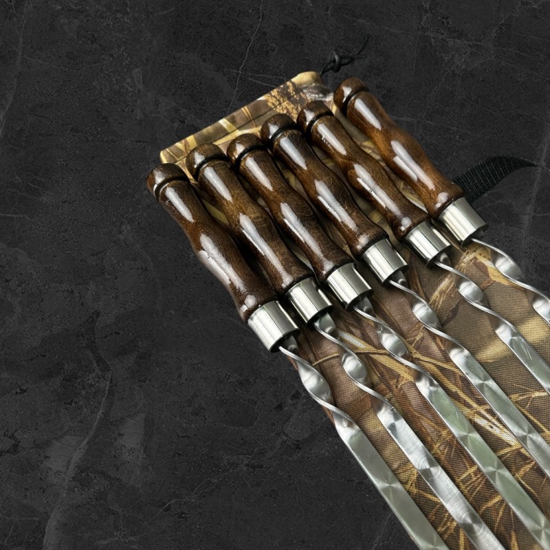 Міцні шампури з якісної сталі забезпечують рівномірне прожарювання та довговічність у використанні. Зручні ручки (червоні або коричневі) добре лежать у руці та не ковзають під час приготування.