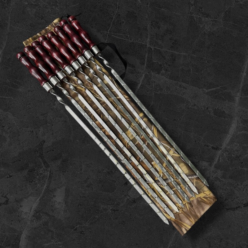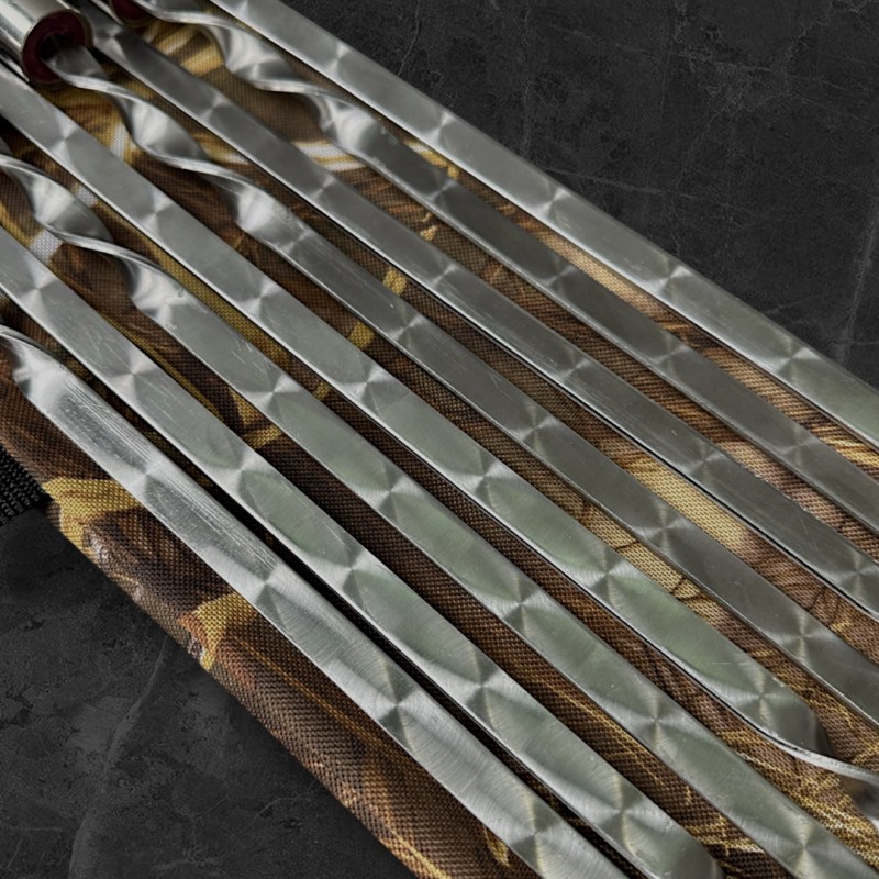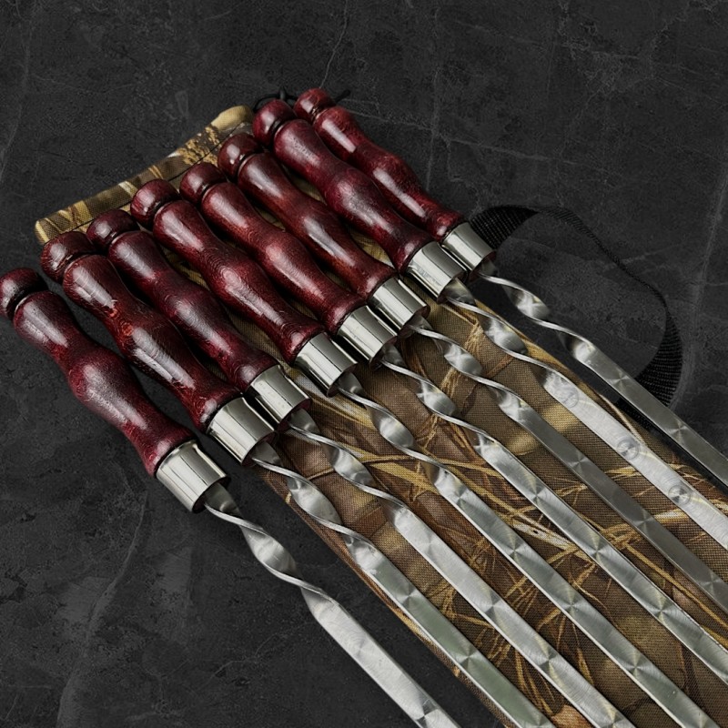 Міцні шампури з якісної сталі забезпечують рівномірне прожарювання та довговічність у використанні. Зручні ручки (червоні або коричневі) добре лежать у руці та не ковзають під час приготування.