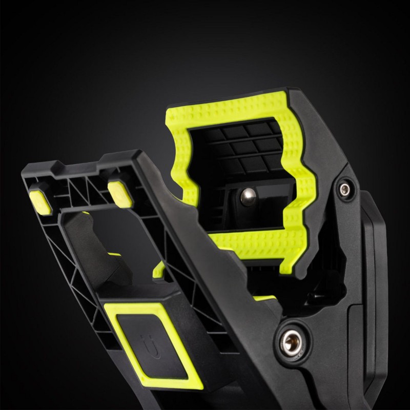 Міцний корпус із захистом IP65 гарантує повну пилонепроникність і стійкість до водяних струменів, а стандарт IK06 (витримує удар молотком вагою 0,5 кг, що падає з висоти 20 см) підтверджує механічну міцність. Завдяки регульованому затиску та магнітному кріпленню Gator Grip можна легко встановити на труби, профілі, столи товщиною до 70 мм чи металеві поверхні, використовуючи його як стаціонарний прожектор або мобільне джерело світла.