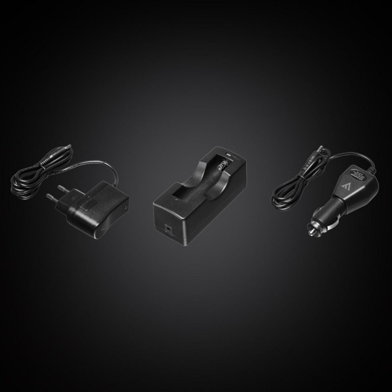 До комплекту ліхтаря входить захисний кейс, чохол, акумулятор 18650 (3,7 V, 3350 mAh, Li-ion), блок живленння для мереж 220V AC і 12V DC, кабель USB-USB-C (100 см), база для заряджання акумулятора, матовий фільтр-дифузор та кольорові фільтри, якісний темляк.