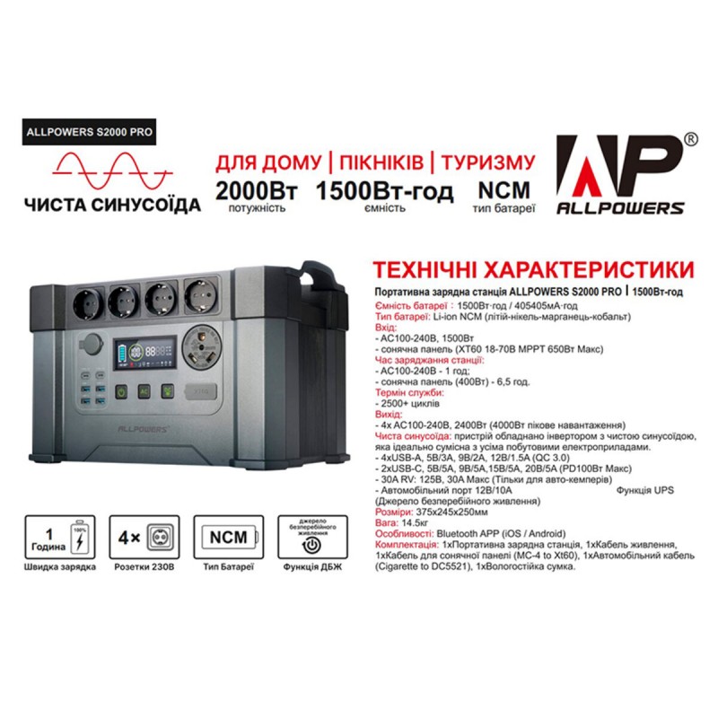 ALLPOWERS S2000 Pro має 4 стандартні розетки змінного струму з чистою синусоїдою, 1 х 13V10A автомобільний порт, 2 х USB-C (PD 100W) та 1 х USB-C (PD 100W). Маючи відмінну потужність 2400W (4000W) та ємність 1500Wh, він буде живити майже всі ваші потужні пристрої (кавоварка, електричний дриль, мікрохвильова піч, електрична сковорода, фен, електричний чайник, холодильник, пральна машина тощо)